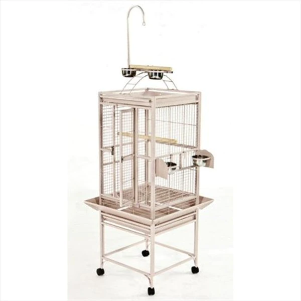 FeaturesBird proof front door & feeder door locksPlay top with 2 ladders. perch. & toy hookHorizontal side bars. vertical bars front & backFront door safety latch3 swing out feeder doors3 stainless steel feeder cups & perchLarge front door for easy accessRemovable seed catcherSlide-out tray underneath play top keeping cage mess freeSlide-out grill & tray for easy cleaningNon-toxic. durable and safe powder coated finishInterior Height – 29 in.Bar Spacing – 5/8 in.Color – SandstoneMaterial – Wrought IronDimension – 24 x 22 x 62 in.