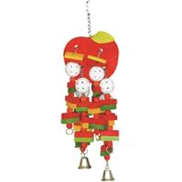Keep your bird occupied with the large apple toy by happy beaks. This toy consists of a large brightly colored wooden pear with a series of chains. wooden beads. wiffle balls. wooden blocks. and 3 bells hanging from it.SpecificationsSize: LargeDimension: 21.26" x 6.3" x 6.3"Weight: 1.5 lbs