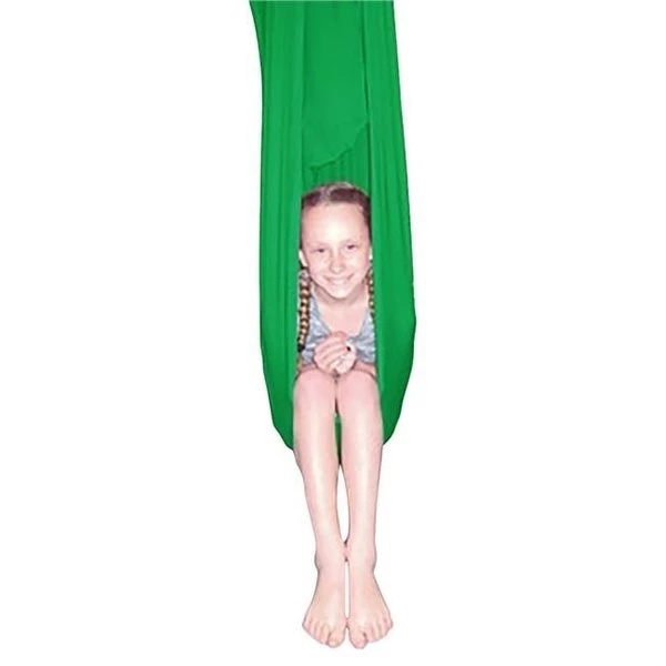 Providing deep touch pressure and gentle vestibular input. this swing makes the perfect sensory solution for a quiet. reading and/or study space. The machine washable fabric is soft to the touch and makes for easy cleaning. Includes integrated loop for hanging on a chain or rope. Swing is designed to be suspended from the ceiling from a rotator or chain attached to an anchor bolt. which has been safely secured into a structural beam. An appropriately sized chain or rope (not included) is needed to lower seat to proper height. Never install swing seat higher than 16 inches from floor. Not to be used with swing stands. Weight capacity is 120 pounds. Measures 60 x 40 inches. Not for children ages 3 and under. Rocking or swinging motion of hanging chairs promotes improved balance/equilibrium and a sense of relaxation/calmness for children of all abilities and needs. FeaturesLycra Cocoon SwingSling swings are statistically-proven and comforting deep-sensory tools for improving children's gross and fine motor developmentConsistent use of activity swing also helps children master stair climbing and safe maneuvering around a roomChildren's swing can be utilized in various positions such as laying down. sitting with legs out. or sitting with legs curled inHanging chair is proudly designed and assembled in the USAIncludes:1 Fabric Activity Swing with Integrated Loop for HangingSpecificationsColor: GreenSize: 60" x 40"Capacity: 120 lbsCountry of Origin: United StatesSafety: No Choking HazardAllergens: Contains No AllergensAge Range: 4+; yearsBase/Mount Type: Anchor BoltMaterial: 96% Nylon 4% Spandex