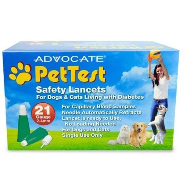 Advocate PetTest 21 Gauge Safety Lancets are single use. self-contained lancing devices designed to provide better blood samples from difficult sampling situations or hard to reach s. Simply twist off the tip and press again the . The 21 gauge needle quickly penetrates and automatically retracts for the simplest. safest and most convenient lancing experience possible. FeaturesFor Capillary Blood SampleNeedle Automatically RetractsLancet is Ready to Use. No Loading NeededDesigned for Dogs and CatsSingle Use Only100 Count BoxSpecificationsDimension: 2.5" H x 4" W x 4.75" LWeight: 0.47 lbs