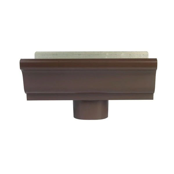 The Amerimax 5 inch gutter end with drop can be used to connect 5 inch gutter to downspout and elbows. This end with drop outlet features a baked-on brown finish with durable aluminum construction and should be used at the end of the gutter run to direct the water into the downspout. Gutter sealant is required for installation and a Seamer should be used to attach to the gutter.