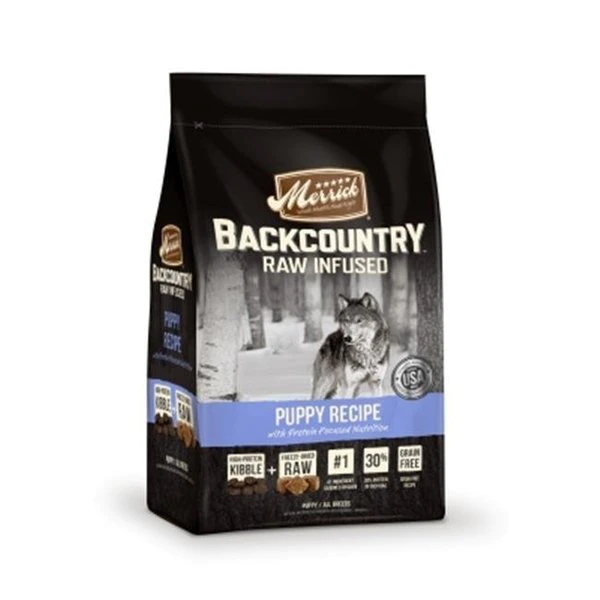FeaturesBackcountry Puppy Recipe Raw-Infused Dry Dog FoodAll-natural grain-free ancestral canine diet packed with protein that dogs craveMerrick's own Safe Quality Food Level 3 organically certified kitchensComplete and balanced nutrition to add moisture and flavor to a dog's diet