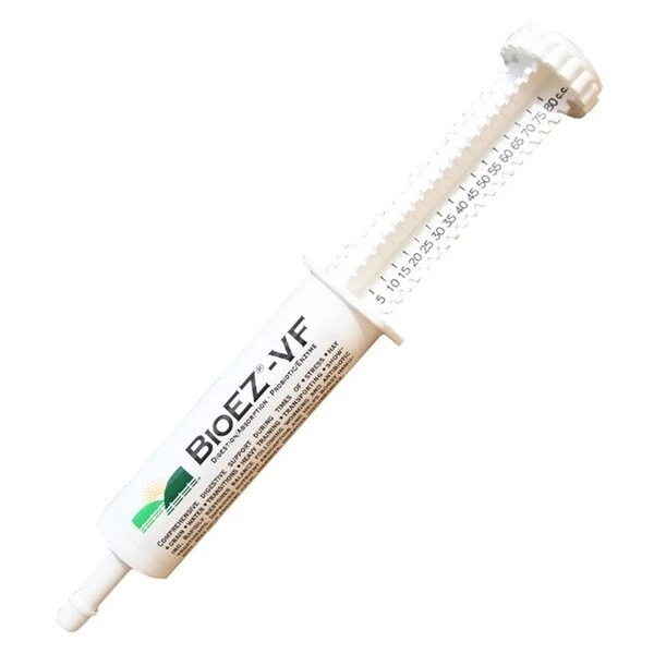 BioEZ-VF Gel Paste is not BioEZ in paste form. BioEZ-VF may help reduce instances of colic, diarrhea and digestive disturbances, while maintaining the proper balance of microflora (healthy bacteria) in the horses’ digestive system can improve their performance, body condition, immune system, and disposition. BioEZ-VF stops diarrhea in one day, prevents diarrhea during showing or transporting, an excellent foal starter and rapidly restores microflora equilibrium following worming and antibiotic treatments.Each tube contains 80 billion cfu of live micro-encapsulated probiotics via six strains, active yeasts, thirteen digestive enzymes, and probiotics to help maintain -fore and hind- digestive function during times of stress. BioEZ-VF can be used in conjunction with BioEZ powder, can be used continuously or in times of stress and does not need to be refrigerated.