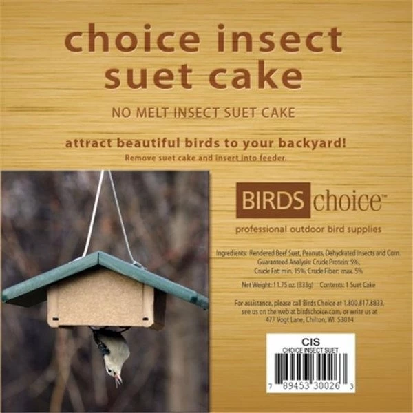 11.75 oz no melt suet cake.Ingredients: rendered beef suet peanuts dehydrated insects and corn.Case of 12.