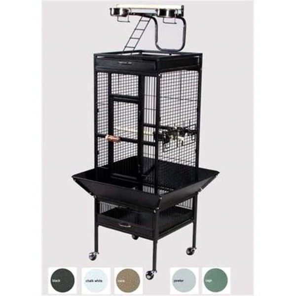 Wrought Iron Select Cage in Black offers quality craftsmanship at an affordable cost. Constructed of wrought iron with a cagetop playstand to keep your bird entertained and content. a heavy-duty push button lock keeps your bird securely inside the cage when playtime is over. This select bird cage also includes four stainless steel cups. two wood perches and a castered stand for portability. Both drawers and bottom grille are removable for ease of cleaning while the rounded corner seed guards control mess around the cage.Select Signature wrought iron cage includes top and bottom pull out drawers. and bottom pull out grille. 4 stainless steel cups. top playpen and rounded seed guards. and cage stand with easy-rolling casters. All cages have heavy duty push button door lock. and 2 wooden perches.Available in black. cobalt blue. chalk white. coco. jade green. garnet red. sage green and pewter.Cage includes bottom grille. 4 stainless steel cups. top playpen and seed guards.Pull-out tray and grille with grille-clip.Measures: 18" L x 18" W x 57" H.0.75" Wire spacing.90 day warranty.