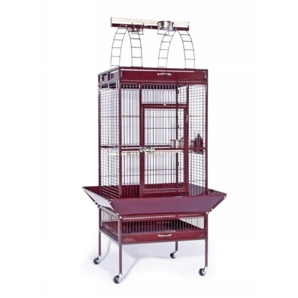 Wrought Iron Select Cage in Garnet Red offers quality craftsmanship at an affordable cost. Constructed of wrought iron with a cagetop playstand to keep your bird entertained and content. a heavy-duty push button lock keeps your bird securely inside the cage when playtime is over. This select bird cage also includes four stainless steel cups. two wood perches and a castered stand for portability. Both drawers and bottom grille are removable for ease of cleaning while the rounded corner seed guards control mess around the cage. The Prevue 3152 Select Series cage offers quality craftsmanship at an excellent value! With 4 stainless steel cups. 2 solid wood perches. a rounded corner seed guard. a pull-out tray and grill with grill clip. and a playpen top. this is a great habitat for your feathered pet. The included Select Signature cage stand has rolling casters so you can easily move the cage to clean or give your pet a change of scenery. The heavy duty push-button door lock ensures your pet's safety.Outside dimensions: 34"L x 30"D x 64-1/2"H.Inside dimensions: 24"L x 20"D x 34-3/4"H.3/4" Wire spacing.4 Stainless steel cups.2 Solid wood perches.Rounded corner seed guard.Pull-out tray.Pull-out grill with grill clip.Playpen top.