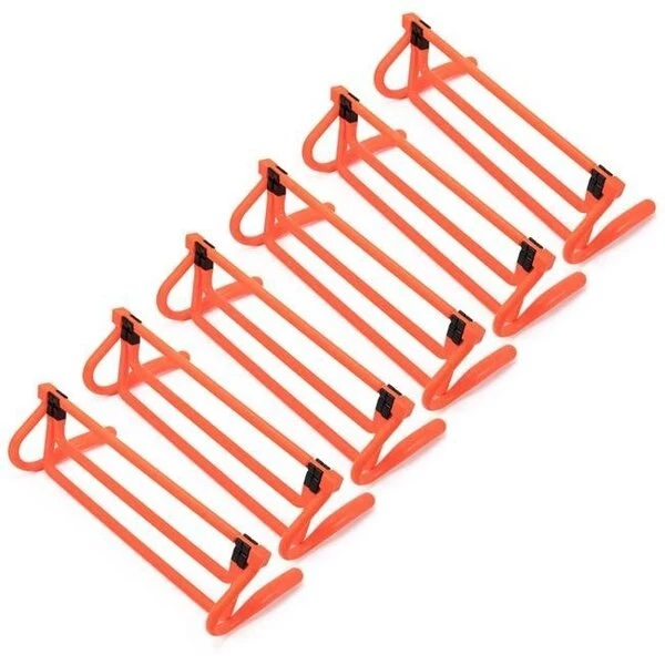 Outstanding footwork is essential for any field sport athlete. Use the agility hurdles to reach peak footwork performance. Made with a durable plastic material. these hurdles can withstand the wide range of weather of conditions that can occur during outdoor practices and training sessions alike. Coming in neon orange. they are highly visible any time of day. perfect for indoor and outdoor use. Each hurdle comes with two snap on height extenders. so you can increase intensity levels with four different heights: 6. 9.25. 11.75. and 15. Practice jumping over them at their tallest height and watch your vertical jump improve over night! The hurdles come in a standard. Though basic in structure. hurdles are some of the most versatile pieces of training equipment available. Hurdles build power. enhance agility. speed. and coordination. and improve overall athletic performance for athletes of all ages. They are ideal for training athletes in a wide variety of field sports: football. soccer. track and field. lacrosse. field hockey and more. They're a great investment for coaches. school athletic departments. and athletes alike. These hurdles are tough enough to handle the roughness of practices. are collapsible. and light enough to take with you on the road. You can utilize all six to create a variety of drills. or adjust the height them for a more advanced workout. FeaturesAgility Hurdles with Height ExtendersPack Of 6SpecificationsSize: 45 cm wide.Weight: 6.9 lbs