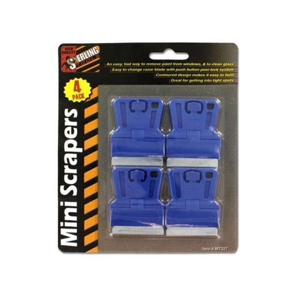 Being in the dollar merchandise business since its beginning, we know what sells, and we are always adding new and different items to our inventory. We are always looking for new items, and we have recently added pet items and craft supplies to our catalog. We design all of the packaging for our items to ensure that categories of merchandise have cohesive matching packaging, and that they are appealing to the eye. This 4 piece set of mini scrapers is an easy. fast way to remove paint from windows and to clean glass. It is easy to change the razor blade with push button posi-lock system. The razor is 1 3/4" long and the entire scraper is 2" tall. Comes with UPC code.Dimensions: Length: 13Height: 13Width: 13
