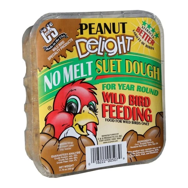 C&S Suet Treats are produced by melting the highest quality beef kidney fat blending a variety of seeds nuts and fruits that are then poured into a tray and allowed to harden. Our Suet Treats will become soft and pliable at 100° F if exposed to extreme heat during shipping and storage but will return to normal hardness again at room temperature. C&S’s quality and special processes allow suet to be fed year round resulting in all season suet feeding success by our consumers.