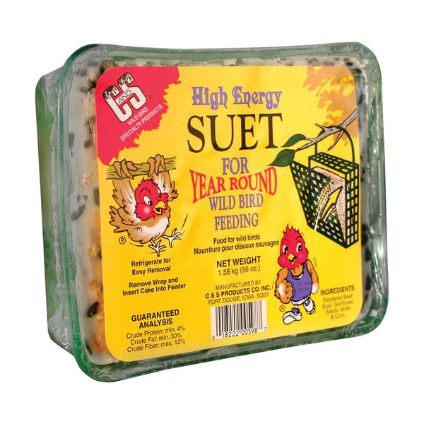 For a suet bird feeder a small wire cage which may be placed in the trunk of a tree or hung from a branch or Shepard hook. For wild bird feeding year round. Nutritionally balanced to provide wild birds with much needed energy when they need it. Rendered beef suet sunflower seeds millet cracked corn melted fat a variety of seeds nuts and fruit.