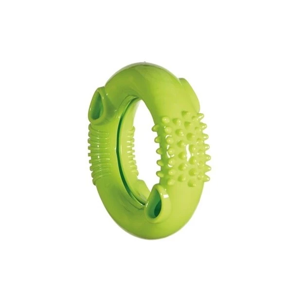 Dogs will enjoy the multiple textures of this versatile chew toy. To use as a treat dispenser, insert food/treats into the oval holes or into the slot on the interior of the ring. Bounce, toss or roll to release treats.