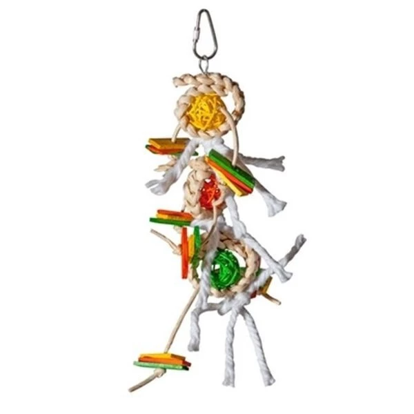 FeaturesThe crunchy husker will offer your bird lots of chewing pleasure.Palm braid. wood shapes. cotton rope and vine balls.Size – Small. 7.5 x 4 in.