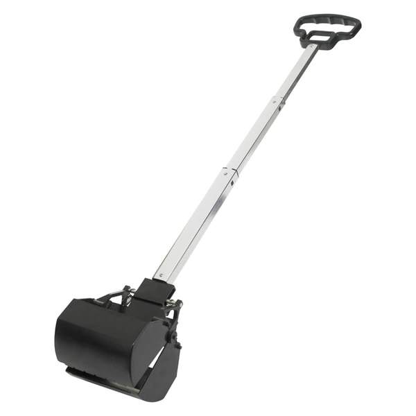 Two-in-one handle allows one handed operation and long handle requires less bending. Bucket closes tight to hold in mess. Works great for other yard clean-up.