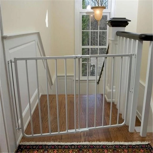 Features: Width is adjustable 27" to 42 1/2" Height 29 1/2" Bar Spacing 2 1/2" Pet Gate Extensions: 10 1/2 for openings 42 1/2" to 53" 21 3/4 for openings 42 1/2" to 64" Available in Black or White The Stairway Special Pet Gate;is our maximum safety gate designed for the top of a stairway but it's great for all areas! Features include a latch system that baffles toddlers yet allows one hand operation for adults. and an optional stop bracket prevents opening over a stairway for greater safety. This dog gate will mount at angles up to 30 degrees allowing location of a stud when mounting on drywall. This pet gate is constructed of aluminum which is lighter weight than steel and rustproof. A powder-coated finish provides a long lasting. easy-to-clean surface and is available in White and Black.