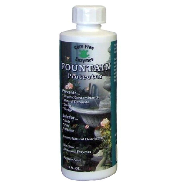 Fountain Protector – Formulated for fountains that contain 1 – 10 gallons of water. Prevents stains sludge and build-up of organic contaminants. Safe for all surfaces and pumps. Also safe for wildlife and pets that may drink from the fountain.