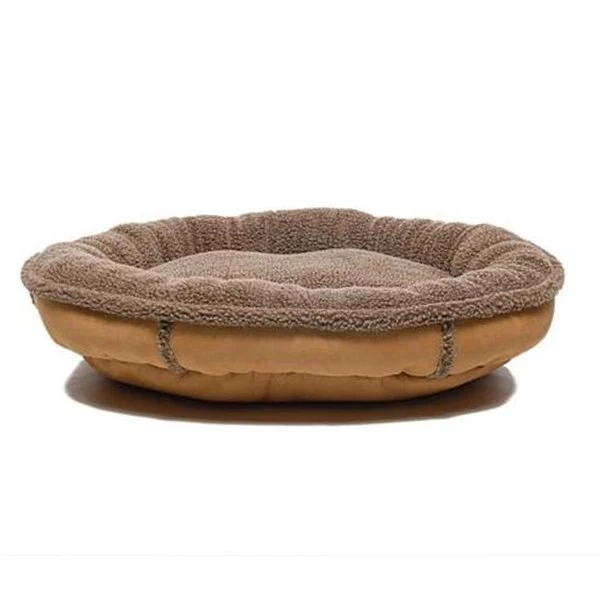 An interpretation of a popular fashion accessory with faux suede and Berber fleece exposed seams. Faux suede cover looks good and feels great. Over-filled to provide the ultimate in comfort and support. Rich. deep-pile Berber fleece sleep deck wraps over the top and outlines the seams. 100% hi-loft recycled polyester fill holds shape and resists compression while allowing the pet to "nest . FeaturesCover is 100% polyester and berber fleece is acrylicLarger sizes require either front load or commercial washing machinesCover is importedRemovable cover is machine washableSpecificationsColor: SaddleSize: SmallShape: RoundType: Poly FillDimension: 6" H x 27" W x 24" DWeight: 6 lbs