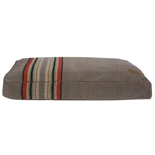 Pup snores away on her own Carolina Pet Company Pendleton Yakima Camp Green Pet Bed. Cozy and rustic. the design is inspired by striped camp blankets used by early sheepherders in the untamed Pacific Northwest. Crafted of ultra-soft non-shearing berber with a faux suede reverse and plumped up with high loft fill from recycled soda bottles. it's a luxurious doggy crash pad. FeaturesContrast cording on top and bottom seamZippered Removable CoverMachine washable100% Polyester Memory Fiber high loft fill made from recycled soda bottlesPolar fleece with 8 oz cotton reverseSpecificationsColor: Yakima Camp UmberSize: Extra LargeFit Guide: Over 100 lbsDimension: 4" H x 48" W x 36" DWeight: 11 lbs