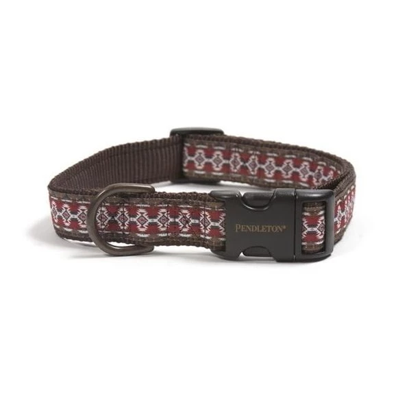 This collar features one of Pendleton's most popular patterns. A grosgrain ribbon woven with the Diamond River pattern in turquoise blue is secured to a nylon webbing. It features a plastic closure. with brass hardware. Adjustable. FeaturesPolyester jacquard woven ribbon sewn to 100% nylon webbingAntique brass accentCustom Pendleton buckleSpecificationsColor: WesterlySize: 1" x 22-26". Extra LargeWeight: 2 lbs