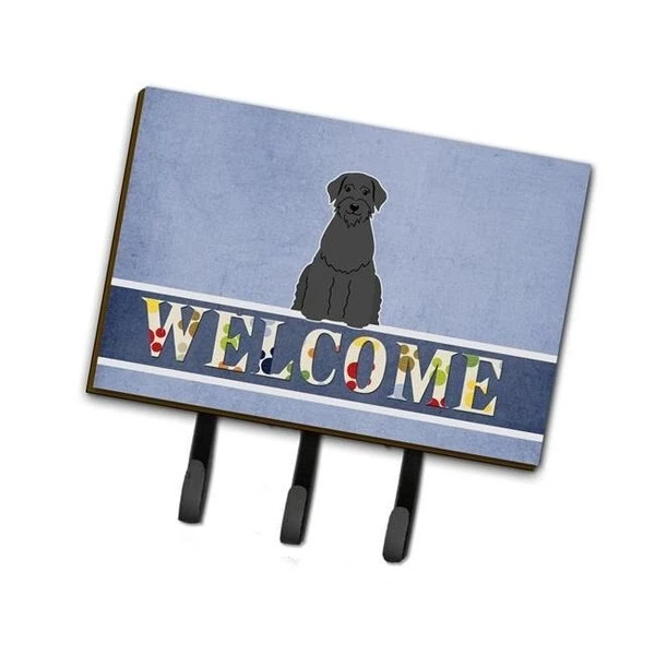Giant Schnauzer Welcome Leash or Key Holder The Triple Hook Leash Holder measures 6 inches wide by 9 inches high. The tile is made from a hardhoard and is mounted to a metal rectangle. The hooks hang down from the metal plate in the back and is about 2 .5 inches from the base. The hooks opens about 1 inch. A hanger is attached to the metal plate and is about 1 .5 inches long. Lots of room to hang up using a screw or paneling nail. Great for the home or office to hold keys. leashes or just about anything. SpecificationsWeight: 1 lbs