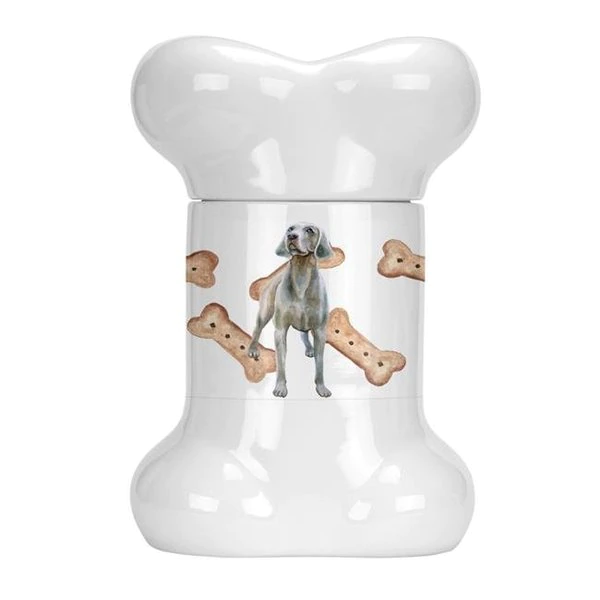 Weimaraner Bone Shaped Treat Jar Do you think you dog is spoiled enough Not unless they have their own bone shaped treat jar. This cookie jar stands 9 inches tall and measures 6 inches wide at the base. It is made from ceramic and decorated with our full color artwork. This biscuit jar is dishwasher safe. Give this at a gift to a groomer. dog walker. pet sitter or buy a couple for yourself. SpecificationsWeight: 3 lbs