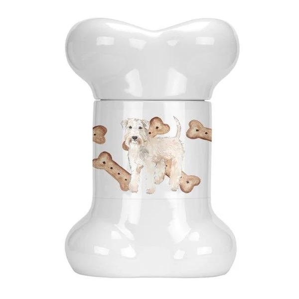 Soft Coated Wheaten Terrier Bone Shaped Treat Jar Do you think you dog is spoiled enough Not unless they have their own bone shaped treat jar. This cookie jar stands 9 inches tall and measures 6 inches wide at the base. It is made from ceramic and decorated with our full color artwork. This biscuit jar is dishwasher safe. Give this at a gift to a groomer. dog walker. pet sitter or buy a couple for yourself. SpecificationsWeight: 3 lbs