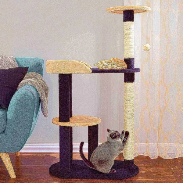 The Pet Adobe 3 tier Sleep and Play Cat tree with 2 scratching posts will provide hours of fun and adventure for cats and kittens while also offering a comfortable place to rest and nap. This attractive cat tree has 3 separate levels and 2 larger scratching posts. The middle level has an escape hole for adventure and fun and a backrest for snuggling and resting. Playing with the hanging ball will keep your cat busy for hours and can be reached from the middle as well as the top level. It is easy to assemble, is covered in soft plush fabric and will look great in any home.