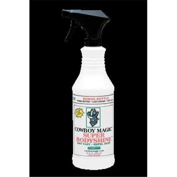 COWBOY MAGIC SUPER BODYSHINEReady to use.Concentrated and use full strength on humans and horse mane and tails.Dilute 10 to 1.Deep cleaning extra suds and easy rinsing.Apply small amount to wet hair massage into a rich lather then rinse thoroughly.UPC : 606786080245Size : 32 OUNCELength : 3.25Width : 3.25Height : 12Product Type : Equine Grooming – Shampoos. Conditioners & Shine / Detanglers & ShineShipping Dimensions: 3.25×3.25×12