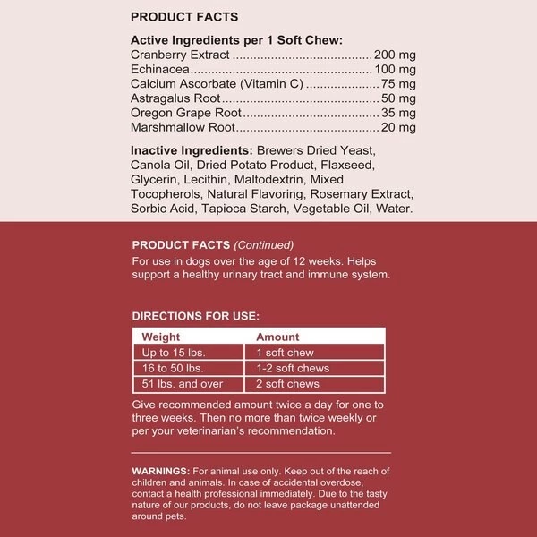 You know how uncomfortable your dog is when he is dealing with urinary tract or bladder issues, and as pet parent, you want to do whatever you can to help. Chew and Heal UTI Treatment Cranberry Chews Dog Supplement is formulated with cranberry to help prevent bladder infections, and echinacea, Oregon grape root, to help boost your dog’s immune system. The added marshmallow root then works to protect your canine companion’s bladder against irritants, by providing a soothing and lubricating barrier. A hard-working soft chew that supports the health of your dog’s bladder, urinary tract, immune system and urethra, Chew and Heal UTI Treatment Cranberry Chews Dog Supplement is safe and effective for dogs of all sizes, even massive breeds. With a delicious taste dogs love, he won’t even believe it’s good for him, too.