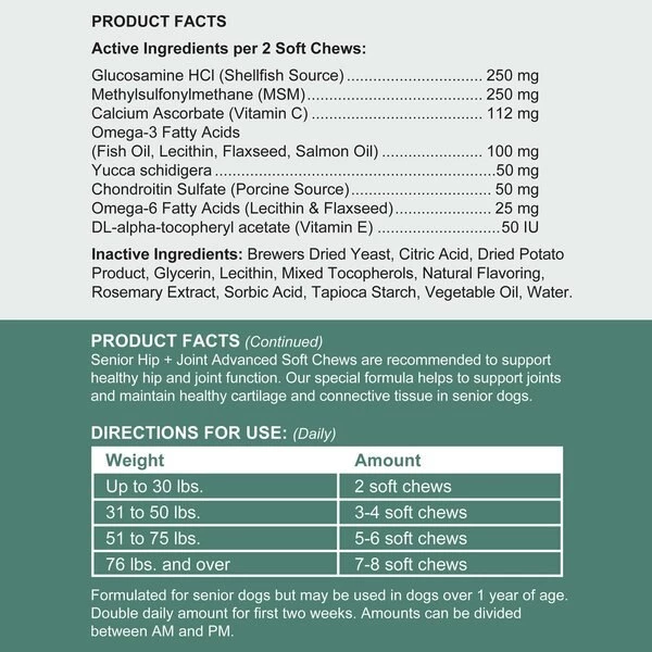 The older we get, the more tender loving care our hips and joints may need. The same is true for your dog, which is why Chew and Heal Senior Hip & Joint Dog Supplement is chock full of the vitamins and minerals your senior dog needs to remain fit as a fiddle. Formulated with glucosamine, MSM, and chondroitin to help reduce pain and inflammation, and increase mobility and joint lubrication Chew and Heal Senior Hip & Joint Dog Supplement is a tasty chew that works to keep your older dog feel young at heart.