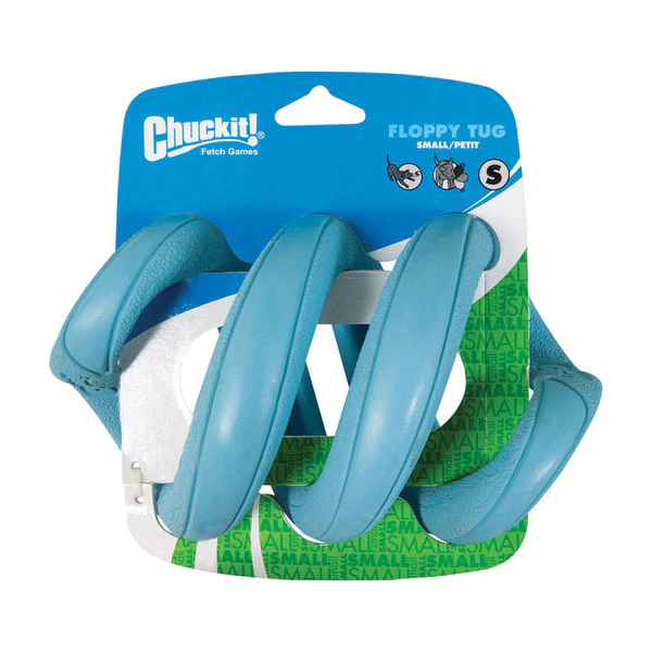 The Chuckit Floppy tug large is a durable rubber chew and tug toy. The coiled spring shape expands and contracts when tugging. Distinctive shape is visually interesting to dogs. Available in different sizes and colors.