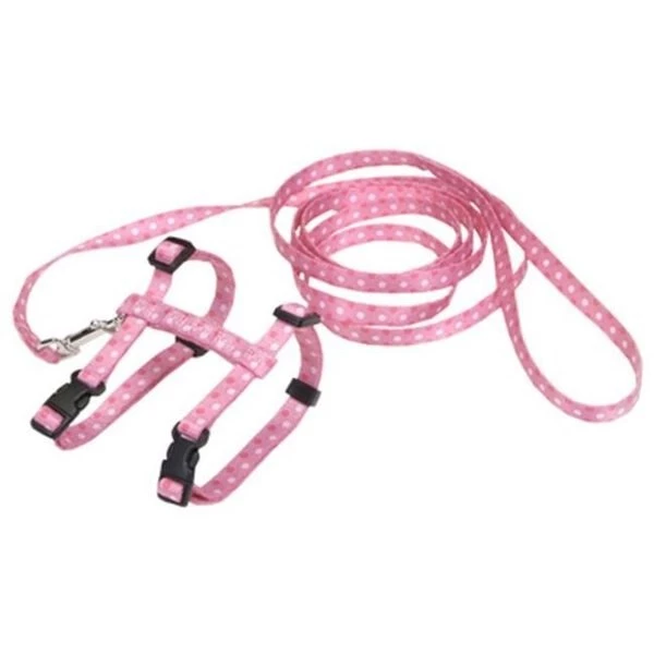 FeaturesPink dot designCat harness/leash comboSnag proof nylonCurved back pad for comfortSwivel o ring for lead attachment.Color – PinkDimension – 8.5 x 4.75 x 1 in.Item Weight – 0.12 lbs.