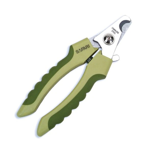 The Safari Professional Stainless Steel Dog Nail Trimmer is made from the finest quality stainless steel to give a long-lasting, sharp cutting edge. Nail trimming should be a regular part of your dog's grooming. It is important to your pet's well-being to keep the nails properly trimmed. Be sure to accustom your dog to having its nails trimmed at an early age to make the experience an enjoyable one and increase the bond between you and your dog.Uniquely designed to offer you a non-slip, comfortable grip that will allow you maintain control when trimming your dog's nails. This will also help prevent any painful accidents.Great for both professional groomers and pet parents alike.Features a double-bladed cutter with a tension spring that helps ensure a swift clean cut. This makes nail trimming less like a chore and is great for left or right hand use.Innovative safety stop greatly reduces risk of injury.Standard size suitable for small to medium dogs, cats, birds and other small animals; large size suitable for medium to large dogs.Applications:For nail trimming and maintenance.