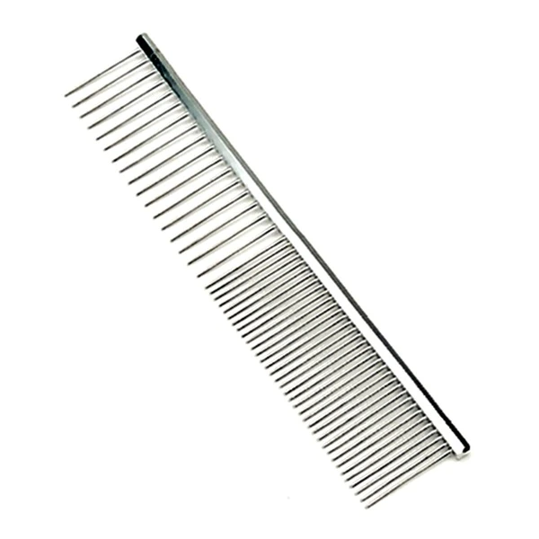 This comb is an excellent all around grooming comb. The wide and narrow spacing of the teeth provide complete grooming. The long teeth penetrate to the root of the hair. Excellent grooming results when used with Safari pin, slicker or bristle brush depending on breed.