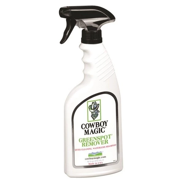 GreenSpot Remover breaks down foreign molecules and dissolves fresh manure, urine, dirt, sweat lines and aluminum trailer buff marks instantly while strengthening and conditioning the skin. Spray on small amount and massage vigorously, wipe off with a clean damp towel. Added shea butter makes hair shine after brushing when dry. Great for last minute touch ups!