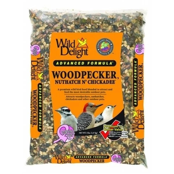 Wild delight advanced formula woodpecker. nuthatch n chickadee food contains real fruits and nuts.A premium wild bird food blended to attract and feed the most desirable outdoor pets.Use with wire mesh feeders. tube feeders (with large holes). platform feeders or hopper feeders.Ingredients: Sunflower Kernels. Peanuts. Pistachios. Safflower Seed. Sunflower Seed. Dried Cranberries. Dried Apples. Hulled Pumpkin Seed. Dried Juniper Berries. Dried Raisins. Dried Papaya. Vitamin A Supplement. Vitamin D-3 Supplement. Vitamin E Supplement. Etc.L x W x H: 14.5 x 10.75 x 2.25