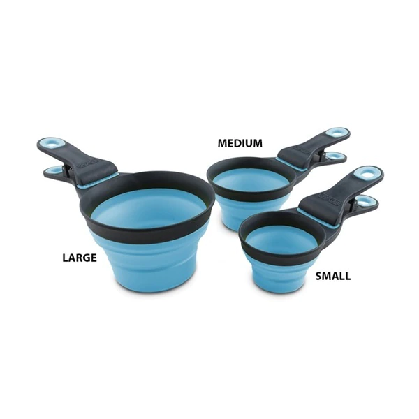 The Dexas Pet KlipScoop is three tools-in-one: food scoop, collapsible measuring cup, and bag clip. Portion control for healthy pets, pre-measured volume helps avoid overfeeding. Attached clip seals pet food or treat bags. Collapses flat for storage, while using as bag clip. Dishwasher safe.