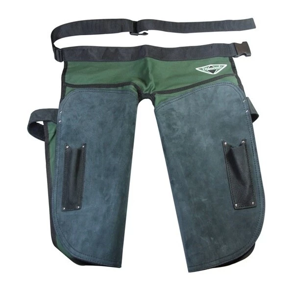 Diamond Farrier Apron is made of strong leather patches double stitched over a heavy-duty cotton apron. Comes with two hoof knife pockets; stitched and riveted for extra durability. This apron features an adjustable quick release buckle and Hook and Loop leg straps. Handmade by skilled Dutch leather workers.