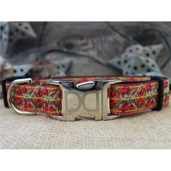 This bold oriental color pallet and finely detailed embroidery is reminiscent of the exotic beauty of this ancient land. Brilliant oranges. reds and greens are a perfect compliment to any colored dog.FeaturesLightweight yet durable materials. perfect for active or outdoor dogsMachine washable. color fast and will not fadeAll weather nickel plated D-ring for leash and tag attachmentDurable plastic buckle & keeper. to hold collar sizeQuality printed polyesterBombay Dog CollarAll-Metal Buckles:Our whisper-weight aluminum buckles weigh less than an ounce!SpecificationsSize: Extra SmallTeacup: 5/8 in. x 6-10 in.Coller Size XS/S: 5/8 in. x 10-16 in.Collar Size M/L: 1 in. x 16-24 in.Collar Size XL: 1 in. x 24-32 in.Weight: 0.06 lbs
