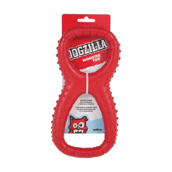 Cut outs allow for easy gripping and carrying for both pet and owner *Rubber bumps massage dog’s gums and help promote good dental health *Solid rubber construction is extra durable to handle aggressive chewing *Perfect for an interactive game of tugging *Dogzilla is Packed with Protein which your dog can taste *Also combines the smell of protein and vanilla