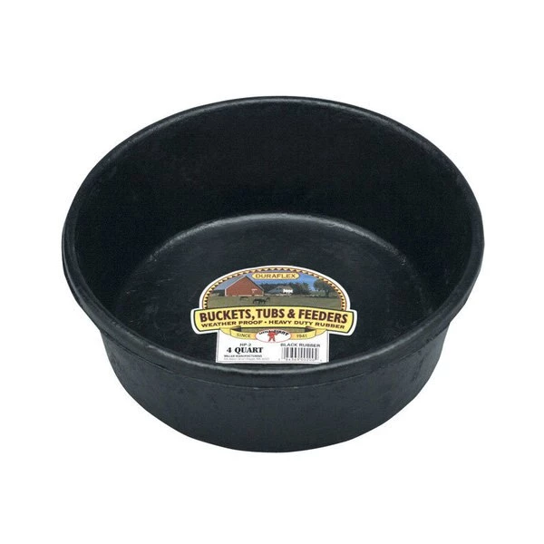 Molded from the finest corded rubber on the market nothing matches the pliability and strength of DuraFlex rubber. Crush-proof crack-proof and freeze-proof so you can use it indoors or outdoors year-round. A great feeding pan that holds up to rugged use and abuse. Rubber is naturally safe and soft for animals. Perfect for dogs rabbits and small livestock. 11 inch diameter by 4 inch high holds 4 quart (1 gallon).