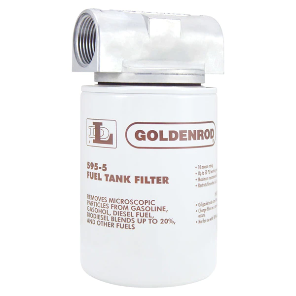 Goldenrod Standard Canister Spin-On Fuel Filter with 1 NPT top cap for use with gasoline gasohol and diesel fuels. Filters microscopic particles (10 microns) of rust sand dirt scale and lint. 426 sq. in. of filtration area. Maximum recommended flow rate is 25 gpm. Working pressure up to 50 PSI. Ideal for farm construction industrial and service station use.