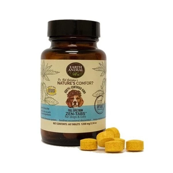Our powerful and unique blend of Full Spectrum oil. ReGen Immune Enhancer Oligopeptides. Uptake Technology and antioxidants makes these tasty tabs the all-in-one choice for animal wellness. Zen-Tabs were formulated for supporting animals suffering from chronic joint diseases and inflammation. They help to regenerate any skin conditions in animals of any age. This effective blend also helps with any of unfavorable physiological effects of stress caused by any environmental factors such as travel. veterinarian visits. or any stressful situation your animal might be suffering from. Zen-Tabs will help boost the energy and vitality of your dog or cat. enhance bone and joint health and promote healthy cell regeneration.Features Soothes occasional discomfortPromotes cellular reproduction Enhances liver and kidney functionsPromotes resistance to pathogensPromotes coronary circulationSupports healthy digestionSupports a healthy inflammatory responseSupports connective tissue healthSupports the central nervous systemSupports normal brain and nerve functionSupports healthy cellular activitySupports performance and endurancePromotes bladder and urinary tract healthDog and Cat Natures Comfort Zen Tabs60 count