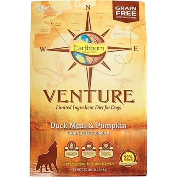 Pamper your pooch while addressing his skin or digestive sensitivities with the lip-smacking taste and exceptional nutrition of Earthborn Holistic Venture Duck Meal & Pumpkin Limited Ingredient Diet Grain-Free Dry Dog Food. Your pup will dash to his bowl for the irresistible flavor of fresh waterfowl. and with no grain or gluten. corn or soy. fillers or additives. you'll love knowing that your furry best friend is eating an exceptional food made with superior ingredients. Meticulously formulated to satisfy all of your dog's nutritional needs. this limited ingredient diet is also a rich source of protein. fiber and the other essential nutrients he needs for superb digestion. a lustrous skin and coat. and optimal overall health. Features100. grain-free and gluten-free limited ingredient diet provides complete nutrition for dogs of all ages and sizesMade with responsibly sourced duck from family farmers in the French countryside and pumpkins from Californian fieldsPacked with protein and fiber. essential vitamins and minerals. and an excellent source of vitamin E and Omega-6Non-GMO formula contains no fillers. by-products. artificial colors or preservatives. and is a rich source of proteinIngredientsDuck Meal. Pumpkin. Peas. Tapioca. Sunflower Oil (Preserved with Mixed Tocopherols. Flaxseed. Natural Flavors. Potassium Chloride. Salt .Choline Chloride. DL-Methionine. L-Lysine. Taurine. Vitamin A Supplement. Vitamin D3 Supplement. Vitamin E Supplement. Zinc Sulfate. Ferrous Sulfate. Niacin. Folic Acid. Biotin. Manganese Sulfate. Copper Sulfate. Calcium Pantothenate. Thiamine Mononitrate. Pyridoxine Hydrochloride. Riboflavin Supplement. L-Ascorbyl-2-Polyphosphate (Source of Vitamin C). Zinc Proteinate. Manganese Proteinate. Copper Proteinate. Calcium Iodate. Sodium Selenite. Vitamin B12 Supplement. Yucca Schidigera Exrtract. Rosemary Extract. Green Tea Extract. Dried Enterococcus Faecium Fermentation Product. Dried Lactobacillus Casei Fermentation Product. Dried Lactobacillus Acidophilus Fermentation Product.Caloric Content: 3.350 kcal. kg. 330 kcal. cupFeeding InstructionsWeight of Dog: 5 – 10 lbs. Daily Feeding: 1. 2 – 1 cupWeight of Dog: 11 – 20 lbs. Daily Feeding: 1 – 1 3. 4 cupsWeight of Dog: 21 – 30 lbs. Daily Feeding: 1 3. 4 – 2 1. 4 cupsWeight of Dog: 31 – 40 lbs. Daily Feeding: 2 1. 4 – 2 3. 4 cupsWeight of Dog: 41 – 50 lbs. Daily Feeding: 2 3. 4 – 3 1. 4 cupsWeight of Dog: 51 – 60 lbs. Daily Feeding: 3 1. 4 – 3 3. 4 cupsWeight of Dog: 61 – 70 lbs. Daily Feeding: 3 3. 4 – 4 1. 4 cupsWeight of Dog: 71 – 80 lbs. Daily Feeding: 4 1. 4 – 4 3. 4 cupsWeight of Dog: 81 – 90 lbs. Daily Feeding: 4 3. 4 – 5 1. 4 cupsWeight of Dog: 91 – 100 lbs. Daily Feeding: 5 1. 4 -5 1. 2 cupsSpecificationsWeight: 25 lbs