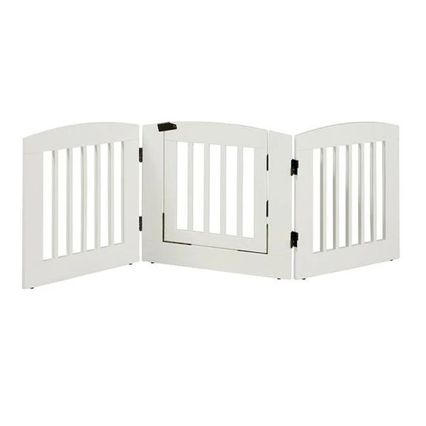 When you need to lovingly limit your pet's access to certain areas in your home. Ruffluv offers you and your dog. the perfect solution with our exquisitely designed Dog Gate collection. Made of 100% solid wood. our gates offer sturdy and hefty construction for years of enjoyment for you and your pet. All wood is from verifiable sustainable sources. Featured in a variety of multi-step. non toxic protective finishes. our beautifully crafted standing gate collection is assured to blend into any home decor. Its zigzag design and double jointed hinge system allows for folding in both directions and easy placement anywhere in your home. They also fold away easily for storage when not being used. The Ruffluv Gates are standing. so you do not have to worry about marring or damaging walls. Designed to be flexible. extra single gate panels and single gate panels with door. can be purchased to add onto existing gate sizes to suite your individual needs. FeaturesRuffluv 3 Panel Expansion Pet Gate with DoorStanding. sturdy. and highly adjustable all-wood pet gate allows you to secure a comfortable space for your petDouble-jointed hinge system allows flexible zigzag configuration or flat folding for storageConstructed of chew-resistant. 100 percent all-natural. solid wood – no use of particleboard or MDF;; beautiful nontoxic finishRubber foot stops on bottom of each gate panel protects floor from scratchesSpecificationsHeight: 24 in. Size: MediumColor: White