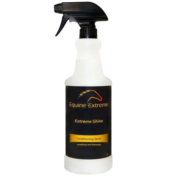The Extreme Shine Conditioning Spray gently softens and detangles your horse's mane and tail and adds shine and luster to their coat. After shampooing with Extreme Clean Antifungal and rinsing well, spray Extreme Shine onto mane and tail then comb out tangles. Reapply if necessary. Hair will be softer, tangle-free, and have a healthy shine. Additionally, Extreme Shine can be sprayed onto a soft brush and worked into the coat as a finishing touch for the show ring or anytime for a soft, healthy coat.