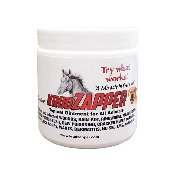 Karla's Original Krudzapper is a topical ointment for all animals that is safe and effective. Formulated using animal fat as its base, and contains a proprietary blend of disinfectants and oils. Krudzapper has been shown to be extremely effective on horses, dogs, cats, livestock, kangaroos, birds, camels and more. Helps with a variety of conditions including ringworm, rain rot, scratches, summer sores, tick sores, lacerations, wounds, fungus, warts, hot spots and more. Highly effective barrier against insects, germs, and water and promotes hair growth. In case of an emergency, Krudzapper is a one-step go to product that is fast acting and is a unique solution when an emergency occurs and no other option is present.