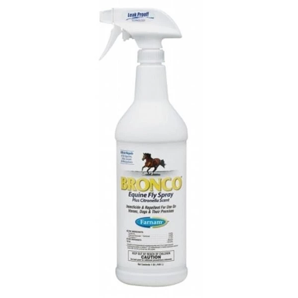 BRONCO E EQUINE FLY SPRAYNew formula contains prallethrin. a proven. effective synthetic substitue for natural pyrethrin.Prallethrin is exclusive to farnam for use in equine products.Repels and kills six fly species. mosquitoes. gnats. fleas and ticks.UPC : 086621023284Color : CITRONELLASize : 32 OUNCELength : 3.25Width : 3.25Height : 12.5Product Type : Equine Fly Control – Fly & Insect Control / Ready To UseShipping Dimensions: 3.25×3.25×12.5