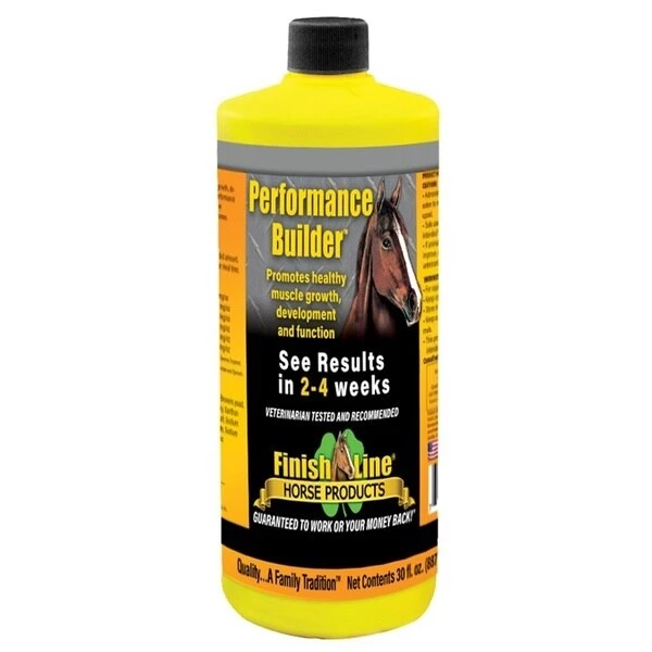 Finish Line Performance Builder promotes healthy muscle development and function in performance horses with rapid results! Exclusive Formula in development for 3 years for improved muscle health and overall performance. WORKS IN WEEKS, NOT MONTHS! Even good horses improve! It contains all the best ingredients you’d want in a healthy muscle builder, from Gamma Oryzanol (from rice bran), and Calcium HMB and L-Leucine to botanicals which make a formula that horses love. Run faster, jump higher, perform better with Performance Builder. Safe and effective for weanlings and older as well as pre-sale horses!Performance Builder has the following benefits for your horse:Contains natural active ingredients like spinach and pea protein.Increased physical appearance in as little as 2-3 weeks.Butterscotch flavor for palatability!Directions for use: Give one fluid ounce daily.