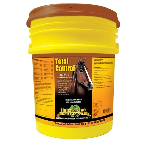 All-in-one Total Control is a combination of Finish Line’s 5 best selling products. These include U-7 Gastric Aid, Iron Power, Apple-A-Day, Fluid Action HA, and Feet First. All of these products combine into one good-tasting daily supplement that helps support 6 systems in your horse: Gastric, Blood Counts, Hydration, Joints, Feet, and Coat.Dosage: 23.2 lb. is 140 day supply for 1 horse at 2 scoops (106cc, 75g) per day.Active Ingredients (per 2 scoops (75g)Glucosamine HCI…..5000mgAloe Vera Concentrate…..130mgPyridoxine Hydrochloride…..42mgSodium Hyaluronate…..100mgSodium Chloride…..14580mgCyanocobalamin…..160mcgAscorbic Acid…..1000mgPotassium Chloride…..9100mgBromelain…..14mgMSM…..2000mgCabbage Powder…..990mgGrapeseed Extract…..32mgOmega 3 Fatty Acids…..3560mgAscorbyl Palmitate…..35mgCalcium Pantothenate…..300mgOmega 6 Fatty Acids…..2410mgIron Sulfate…..1870mgFolic Acid…..20mgYucca…..100mgThiamine Monoitrate…..140mgZinc Gluconate…..8mgNiacinamide…..300mgRiboflavin…..140mgVitamin A…..12350IUTurmeric…..85mgBiotin…..15mgVitamin E…..100IUSlippery Elm…..67mgMethione…..130mg