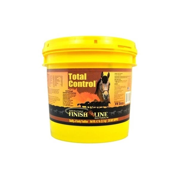 All-in-one Total Control is a combination of Finish Line’s 5 best selling products. These include U-7 Gastric Aid, Iron Power, Apple-A-Day, Fluid Action HA, and Feet First. All of these products combine into one good-tasting daily supplement that helps support 6 systems in your horse: Gastric, Blood Counts, Hydration, Joints, Feet, and Coat.Dosage: 4.7 lb. is 28 day supply for 1 horse at 2 scoops (106cc, 75g) per day.Active Ingredients (per 2 scoops (75g)Glucosamine HCI…..5000mgAloe Vera Concentrate…..130mgPyridoxine Hydrochloride…..42mgSodium Hyaluronate…..100mgSodium Chloride…..14580mgCyanocobalamin…..160mcgAscorbic Acid…..1000mgPotassium Chloride…..9100mgBromelain…..14mgMSM…..2000mgCabbage Powder…..990mgGrapeseed Extract…..32mgOmega 3 Fatty Acids…..3560mgAscorbyl Palmitate…..35mgCalcium Pantothenate…..300mgOmega 6 Fatty Acids…..2410mgIron Sulfate…..1870mgFolic Acid…..20mgYucca…..100mgThiamine Monoitrate…..140mgZinc Gluconate…..8mgNiacinamide…..300mgRiboflavin…..140mgVitamin A…..12350IUTurmeric…..85mgBiotin…..15mgVitamin E…..100IUSlippery Elm…..67mgMethione…..130mg